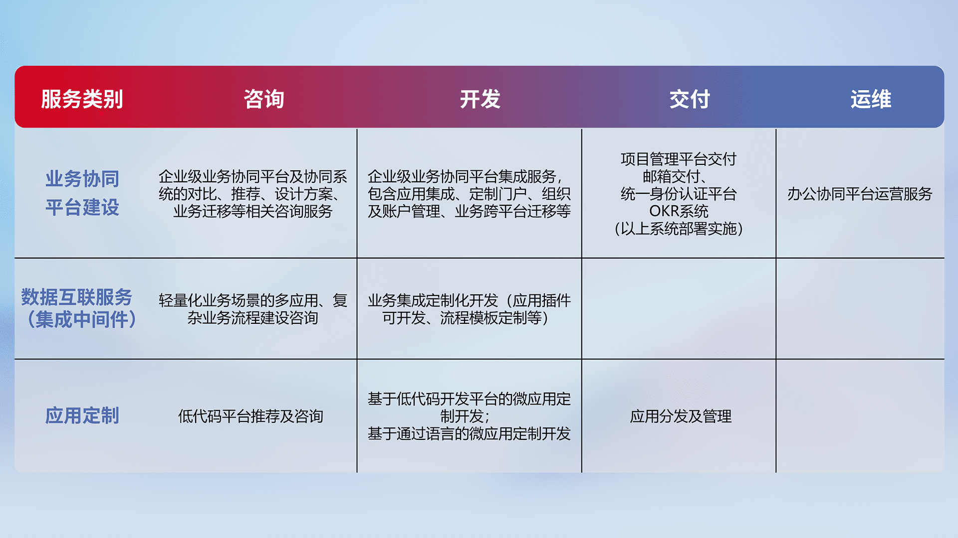 针对钉钉、、、、企微、、IDaas等平台级产品提供产品的规划、、、、方案、、、交付、、、定制化开发等服务,,实现如统一协同办公、、智能客户服务、、混合会议管理、、、、智能数据查询、、等业务场景,,,实现数字化转型。。。。